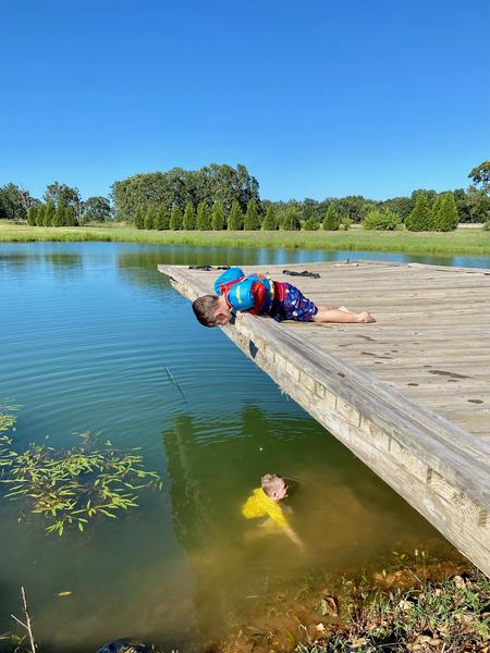 After a short ten-minute drive, I saw one little grandson lying belly down, with his head peering over the edge of their pond’s dock. He was talking with his older brother, who was in the water swimming. They were getting ready to climb on their family’s paddleboard, so they could giggle more and