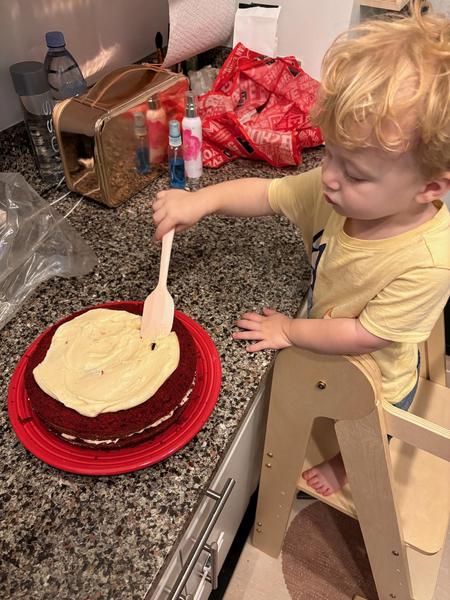 saw her impact again this week as I received a photo of nearly-two-year-old Lachlan standing on his cooking stool, smoothing frosting on the birthday cake he and his mother were creating for his father. Birthday cakes are a common tradition. So, that’s not what caught my eye here. It was the red plate sitting under that being-prepared cake that merited a stuck-stare.