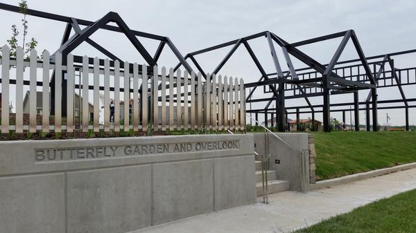 The garden’s “penciled” outline of homes represents all homes erased by the storm. There is also a thirty-eight-segment waterfall representing the number of minutes the tornado was on the ground.